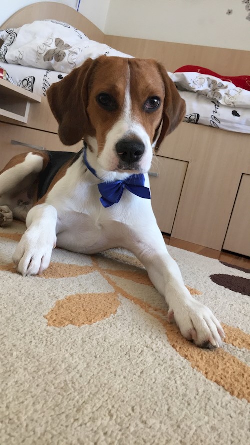 E vorba de un Beagle in varsta de 1 an. Trebuie plimbat zilnic de 2-3 ori. Mananca doar bobite de 2 ori pe zi si noaptea doarme fara probleme. E vorba chiar de Bagle-ul din filmuletul PRO-TV.
